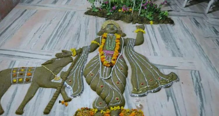 घर के मुख्य द्वार के सामने गाय के गोबर से गोवर्धन पर्वत की आकृति बनाएं। इसके चारों ओर ग्वालों, पशुओं, पेड़ों और पौधों की आकृति बनाना भी शुभ माना जाता है। इसके बीच में भगवान श्रीकृष्ण की मूर्ति या तस्वीर रखें।